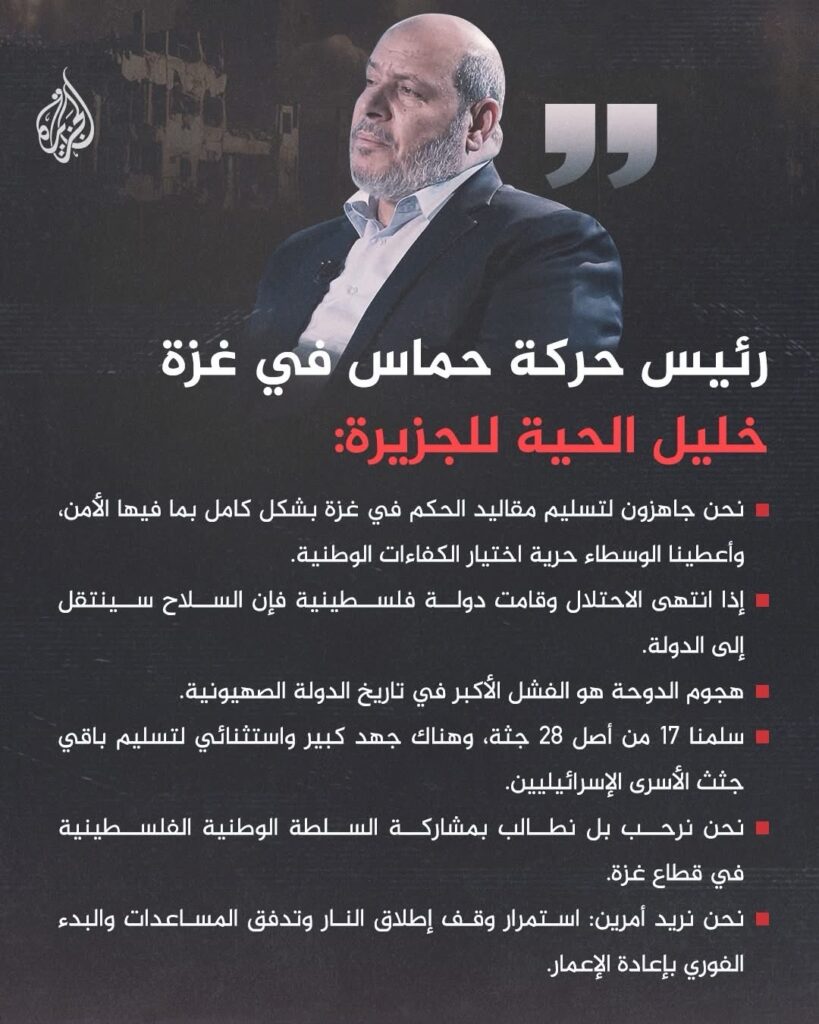 Al-Hayya je ponovo potvrdio da je oružje palestinskog otpora povezano s postojanjem okupacije i agresije, ističući: „To pitanje je još uvijek predmet rasprave s frakcijama i posrednicima.“